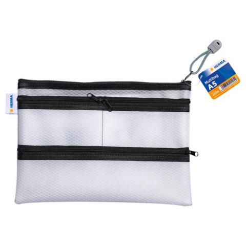 Irattartó tasak Herma Multibag A/5 cipzáras A fekete színű HERMA Multibag irattartó tasak négy különálló cipzáras zsebbel rendelkezik, ezáltal rengeteg helyet kínál a mindennapi apróságoknak.A legnagyobb zseb A/5 méretű dokumentumok tárolására alkalmas