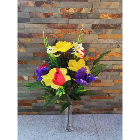 1 kép Írisz nárcisz tulipán selyemvirág csokor zöldekkel rumórával 57 cm