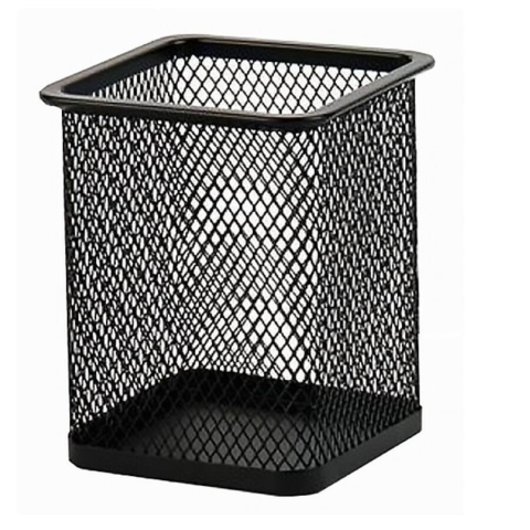 Fémhálós, fekete, szögletes írószertartó pohár.