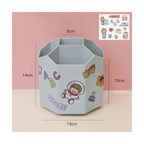 Írószertartó matricával kékSzeretnéd gyermeked íróasztalát, minden szükséges dologgal felszerelni, aminek nagy hasznát veheti nem csak a tanévben, de a nyári szünetben is segít rendben tartani az íróasztalt?Válasszátok ezt az 5 rekeszes, 360°-ban forgatható írószertartót, amit most matricákkal együtt adunk!A nagy tároló kapacitásának hála, az összes ceruza, toll, filctoll helyet fog kapni benne. Forgatható kialakításának köszönhetően, minden felszerelés k