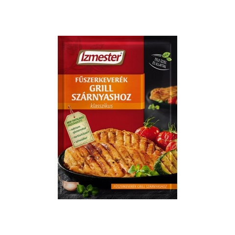 Ízmester fűszerkeverék 30g-os kiszerelésben grill szárnyasokhoz. Összetevők: étkezési só, édes paprika, vöröshagyma, cukor, fokhagyma (4%), kakukkfű, fűszerkömény, borsikafű, majoránna (2%), chili, fehér mustármag, tárkony, rozmaring. A termék gluté