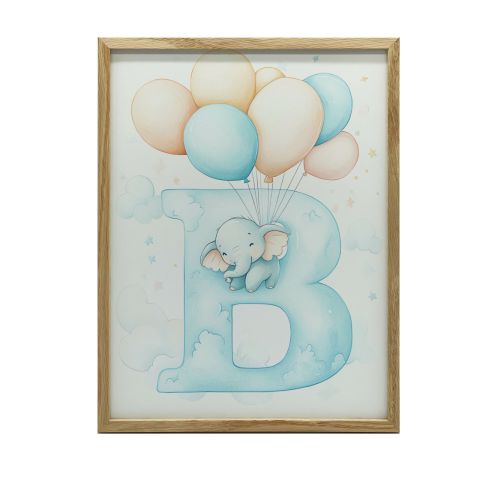 B betűs elefántos faliplakát - Vidám dekoráció gyerekszobába 🐘🎈 Ez a bájos faliplakát egy aranyos elefántot ábrázol, aki léggömbökkel repül a felhők között, egy nagy B betű mellett. Tökéletes választás a gyerekszoba dekorációjához, vidám és játékos...