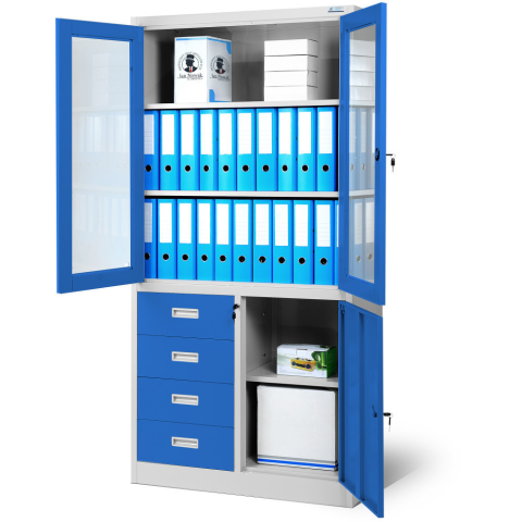 1 kép JAN NOWAK® - WIOLA fém iratszekrény vitrinnel és fiókokkal / KÉK