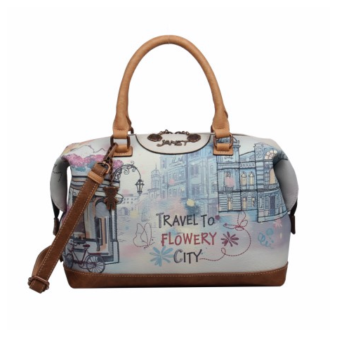 A Janet Flowery City kézitáska könnyed, romantikus városképet idéző grafikájával és finom pasztellszíneivel nőies, bájos megjelenést kínál.
