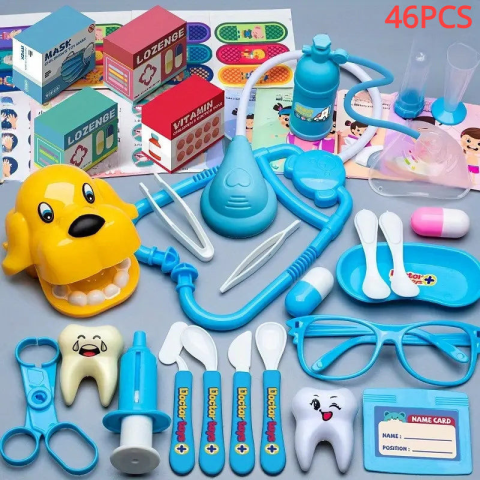 Játék állatorvosi szett, sztetoszkóppal, fecskendővel és fogászati eszközökkel orvosos játék árgrafikon