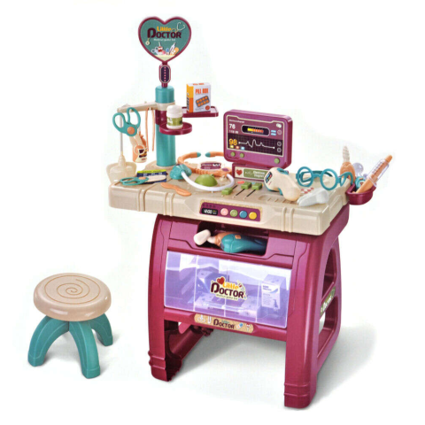 Aranyos, kisgyermekekre méretezett röntgenasztal. A termék sok kiegészítőt illetve beépített hang- és fényeffekteket tartalmaz, így igazán élvezetes lehet a gyermekek játéka. A röntgenasztal 4 db AA elemmel működik, melyet a készlet nem tartalmaz. Az egyéb, effektekkel rendelkező kiegészítők az elemet is tartalmazzák.Tartalma:röntgenasztalkis szék (18,5 cm magas)szemüvegcsipeszleveles gyógyszerszikeinjekciókalapácsfúró2 db ollófonendoszkóp (hangeffekttel)oxigé