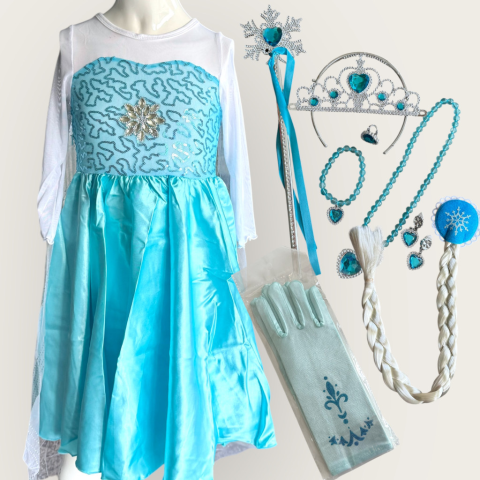 Jégvarázs-Elza jelmez kiegészítőkkel Kerek nyakú, ujja áttetsző, csillogó flitterekkel és kövekkel. Kiegészítők: pálca, korona, hajtincs, kesztyű, nyaklánc-és fülbevaló (klipsz), gyűrű, karkötő. Új, címkés (outlet) termék.