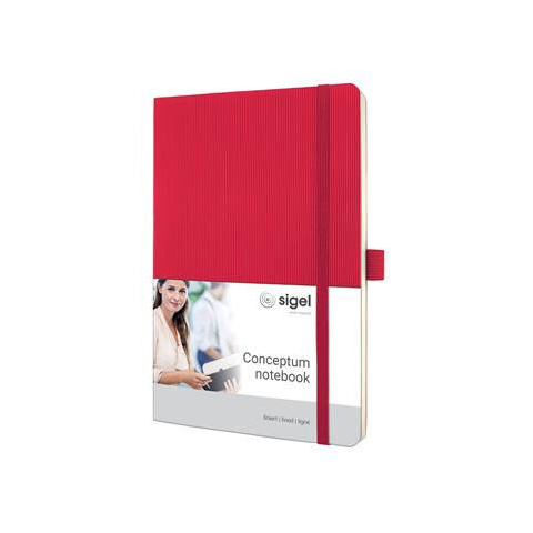 Jegyzetfüzet, exkluzív, A5, vonalas, 97 lap, puhafedeles, SIGEL Conceptum, piros A lenyűgöző Softwave dizájn puha kötésű változata rugalmasságával nyűgözi le közönségét. -gumiszalagos záródás -oldalán tolltartó -belül sarokzseb és archiválózseb névjeg