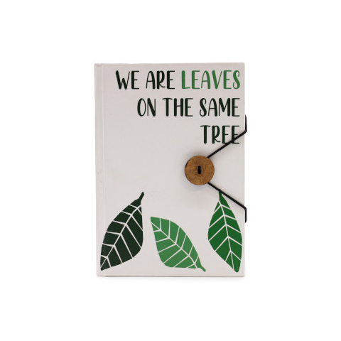 Ez a Kis Jegyzetfüzet 200 újrahasznosított papírból készült tiszta lapot tartalmaz. Zsinórral van ellátva és kókusz gombbal zárható. Jegyzeteléshez, skicceléshez egyaránt megfelel.Inspiratív felirattal: mindannyian ugyanannak a fának a levelei vagyunk.200