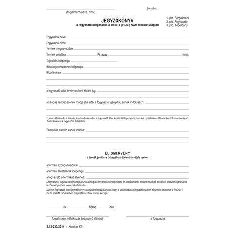 Jegyzőkönyv a fogyasztó minőségi kifogásáról, 25*3, A5, B.13-233