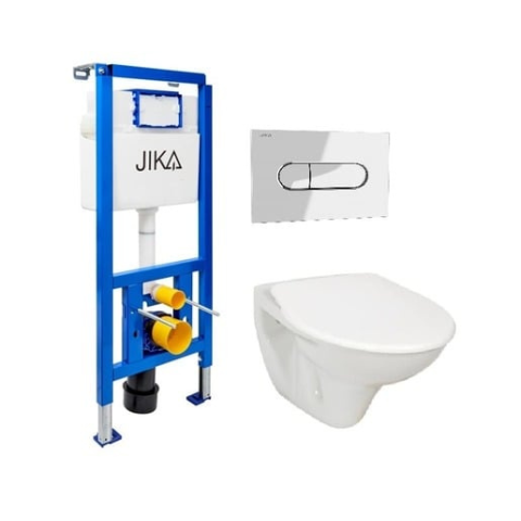 Fali wc szett - a szett tartalmaz dvojčinnémodul könnyűszerkezetes falakba / falsík előtti, WC tartállyal Jika, és WC tartály. WC ülőke alapanyaga thermoplast. Nyomógomb alapanyaga műanyag krómozott fényes színu.