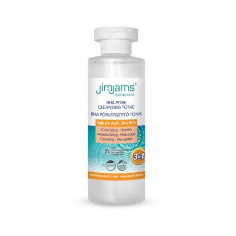 A JimJams Pure & Clear BHA pórustisztító tonik egy alkoholmentes hidratáló tonik problémás bőrre. Az antibakteriális cink és szalicilsav (BHA) segít a pórusokban felgyülemlett faggyú eltávolításában és a pattanások megszüntetés