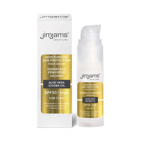 JimJams Serum Line Hidratáló fényvédő arckrém SPF30, 30ml - Gyorsan beszívódik, nem hagy fehér nyomot a bőrön, nincs ragacsos érzet - Véd az UVB- és UVA-sugárzástól - Rendszeres használata segít megelőzni a bőr idő előtti öregedését - Bőrápoló Aloe Vera