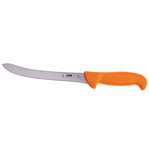 JMB halszeletelő kés 210mm flexi pengével Svéd minőségű Sandvik 14C28N acélból készül. Ez a legfejlettebb high-tech késacél magas nitrogéntartalommal. Ideálisan finom és homogén szerkezetének köszönhetően ez az acélfajta nagy keménységet, kiváló éltart