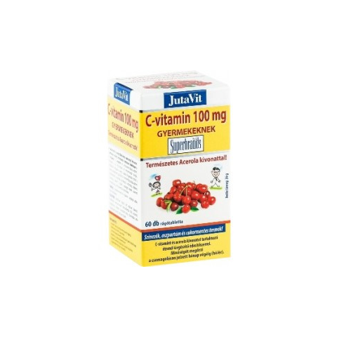 JutaVit C-vitamin 100 mg GYERMEKEKNEK FAMILY Természetes Acerola kivonattal! Laktózmentes. Gluténmentes. Mesterséges színezéket és aromát nem tartalmaz! C-vitamint tartalmazó étrend-kiegészítő készítmény édesítőszerekkel vadcseresznye ízben.
