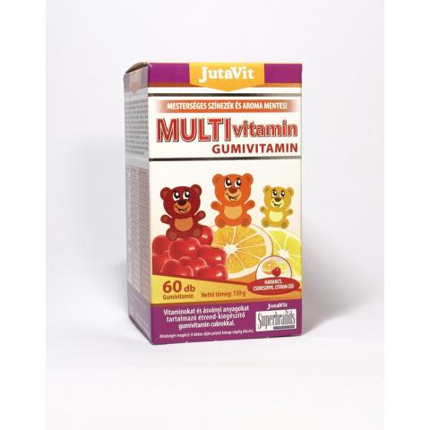 A JutaVit Multivitamin gumivitamin 60 db-os gyümölcs ízű vitaminokat és ásványi anyagokat tartalmazó étrend-kiegészítő gumivitamin terméke. JutaVit Multivitamin gumivitamin, 60 db. Mesterséges színezék és aroma mentes! Narancs, cseresznye, citrom ízű