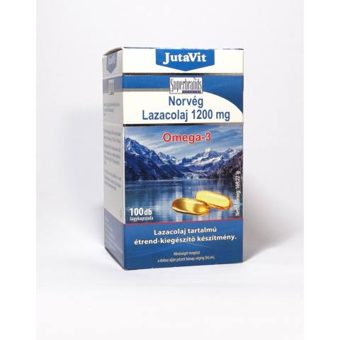 A JutaVit Norvég Lazacolaj 1200mg Omega-3 lazacolaj tartalmú 100 db-os étrend-kiegészítő készítmény. A termék minden kapszulája 1200 mg norvég lazacolajat tartalmaz, ami egy tiszta omega-3 EPA, DHA, DPA forrás. Az Eikozapentaénsav (EPA) és Dokozahexaénsa