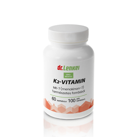 Dr. Lenkei K2-vitamin 100 mcg kapszula, étrend-kiegészítő, 60 db GMO-MENTES. A K2-vitamin (menakinon) fontos szerepet játszik a csontozat egészségének fenntartásában, mivel segíti a kalcium beépülését a csontokba. Javasolt napi adag: 1 kapszula. ÖSSZET