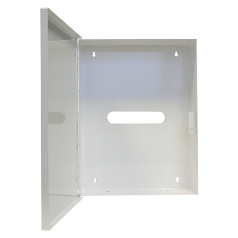 Fehér színű, festett fémdoboz zongorapántos ajtóval, széles kábelbevezető nyílásokkal, szellőzőnyílásokkal A doboz főbb jellemzői Fehér színű, festett fémdoboz. Panelek, modulok számára előre kialakított furatok. Szellőzőnyílások. Széles kábelbevezető nyílások. Oldalra nyíló, zongorapántos ajtó. Mérete: 435 x 335 x 100 mm.