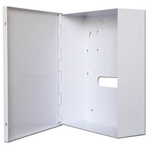 Fehér színű, festett fémdoboz zongorapántos ajtóval, széles kábelbevezető nyílásokkal, szellőzőnyílásokkal A doboz főbb jellemzői Fehér színű, festett fémdoboz. Panelek, modulok számára előre kialakított furatok. Szellőzőnyílások. Széles kábel bevezető nyílások. Oldalra nyíló, zongorapántos ajtó. Mérete: 435 x 330 x 170 mm.