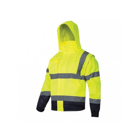 • Külseje: 100% poliészter Oxford 300D 180 g/m2 PU membránnal borítva. Szigetelés:100% poliészter 160 g/m². Bélése: 190T poliészter Taffeta 54 g/m² • Fényvisszaverő csíkok. Vízálló varrások. Gallérba rejthető, állítható méretű kapucni. Tépőzárral állítható mandzsetták. Állítható derékrész. Cipzár és kapoccsal ellátott pótcsík az összezáráshoz. Állítható mandzsetták. 5 zseb, melyek közül 1 cipzárral zárható (4 külső és 1 belső). • NO