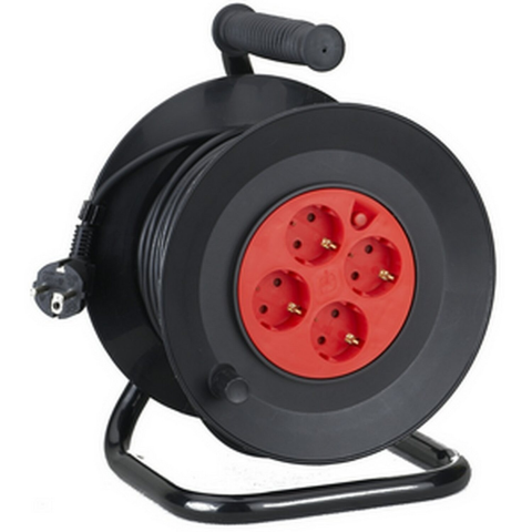 Kábeldob, műanyag, 25 m hosszú veztékkel, 4 dugalj, fekete/piros színű, 250 V, 16 A, H05VV-F 3 x 1.0 mm2, IP20.