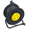 Kábeldob, műanyag, 50 m hosszú vezetékkel, 4 dugalj, fekete/sárga színű, 250 V, 16 A, H05VV-F 3 x 1.5 mm2, IP20.