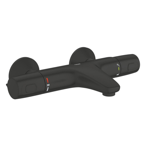 Termosztatikus fali kád csaptelep zuhanyszett nélkül fekete matt színben. A csaptelep térfogatárama 20 liter / perc. A csaptelepek távolsága 150 mm. Matt felülettel.