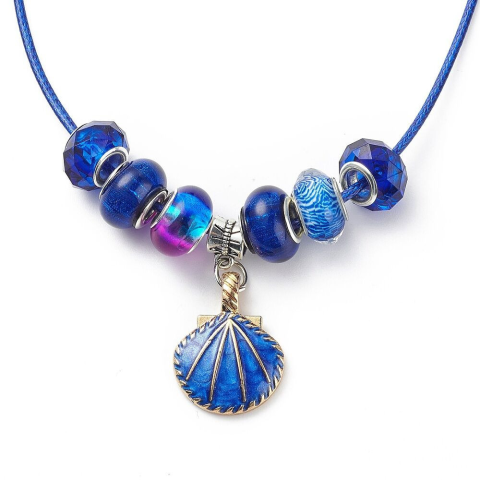 Kagyló medálos műbőr női nyaklánc kék üveg díszekkel. Mutatós, friss stílusú kék nyaklánc, nyár elemekkel. Méret: lánc: 1.6 mm széles, 445~455 mm hosszú, hosszabbító lánc: 43x4x1.7 mm, csat: 12x7x3mm. Gyöngyök: 13.5~14 mm átmér