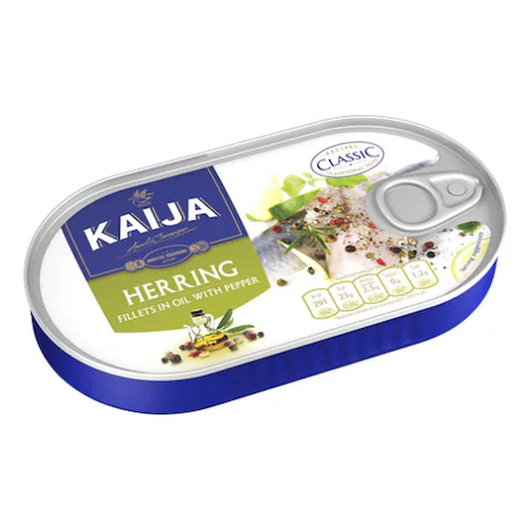 KAIJA hering filé borsos olajban, 170 gÖsszetevők:77,4 % BALTI HERING (CLUPEA HARENGUS MEMBRAS) (filé), 21,0 % repceolaj, étkezési só, 0,6 % fekete bors