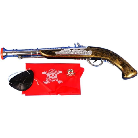 40 cm-es, fém és fa hatású, műanyag, kalóz pisztoly, kendő, szemkötő és gyűrű