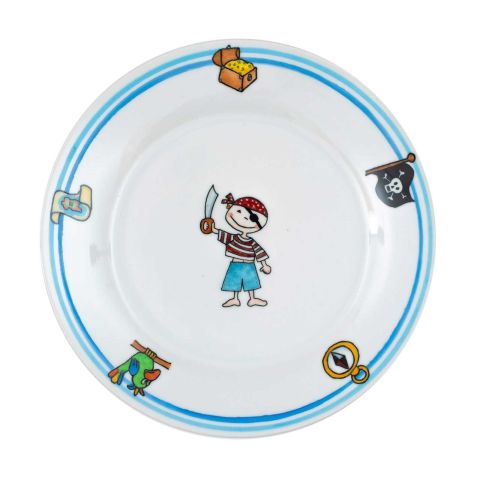 Kalózos tányérKézzel festett porcelán tányér. mely felirattal névre szólóvá is tehető.A porcelánt festés után 820 fokon égetem ki, mikrohullámú sütőbe betehetők, mosogatógépben tisztíthatók.