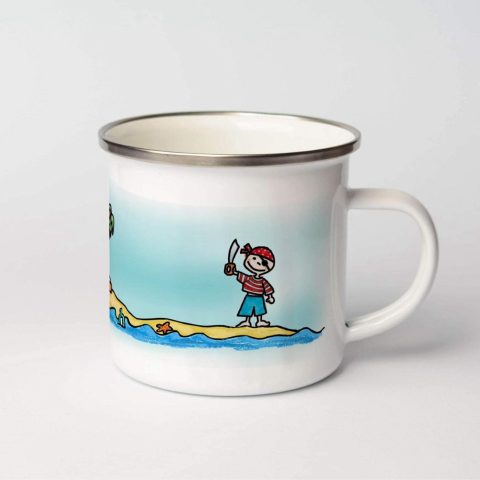 Zománcozott fém bögre kalózos, hajós, lakatlan szigetes mintával, amely felirattal névre szólóvá is tehető.A fém anyag miatt mikrohullámú sütőbe nem tehető be. Mosogatógépben tisztítható.