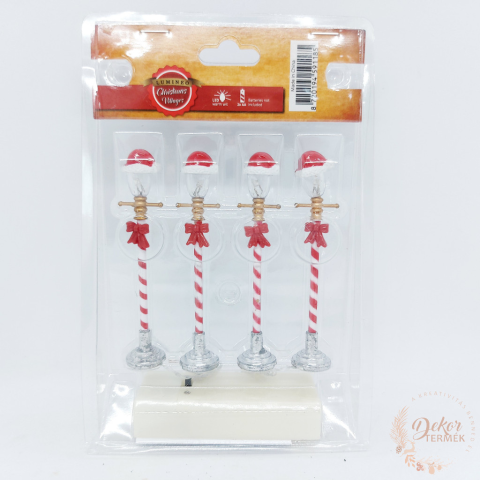 Méret: 10 cm Szín: piros-fehér Anyag: műanyag Tömeg: 87 gramm A szett 4 db kandelábert tartalmaz. LED-es, meleg fehér fényű. 2 db AA elem szükséges hozzá, ezt a csomagolás nem tartalmazza! A kandeláber dekoráció hangulatos kiegészítője a karácsonyi d