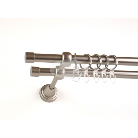 A KANSAS 240 cm-es nikkel-matt színű 2 rudas fém karnis szett tartalma: 2 db 240 cm-es nikkel-matt színű 16 mm átmérőjű fém karnisrúd 4 db Kansas típusú nikkel-matt színű kupak formájú fém karnis végzáró 3 db falra szerelhető fém konzol 48 db fém karika