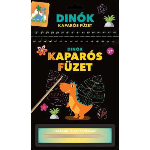 A Kaparós füzet – Dinók különleges foglalkoztató, amely játékos formában vezeti be a gyerekeket a dinoszauruszok világába. A kaparópálca segítségével a fekete réteget eltávolítva színes dinók és őskori tájak jelennek meg. Ez a kreatív tevékenység fejleszt