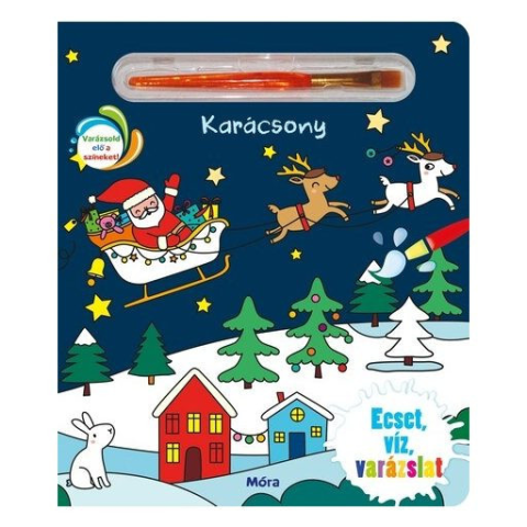 Tél van, fehér a táj, de a karácsonyfa alá színesebbnél színesebb ajándékok kerülnek. Vizezd be a könyvben található ecsetet, és húzd végig a sörtéit a lapok világos részein! A színek mintegy varázsütésre megjelennek. Miután a papír megszáradt, ismét eltű