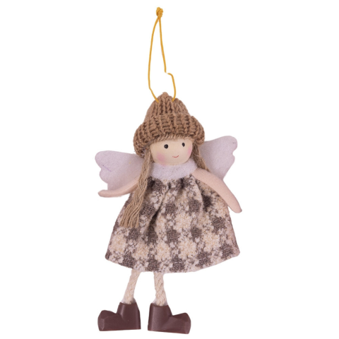 Karácsonyfadísz - Kötött sapkás angyal kockás, barna-fehér ruhában fajáték árgrafikon