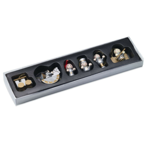 Karácsonyfadísz szett6 darabos fa karácsonyfadísz szett. Átlátszó fedelű kartondobozban