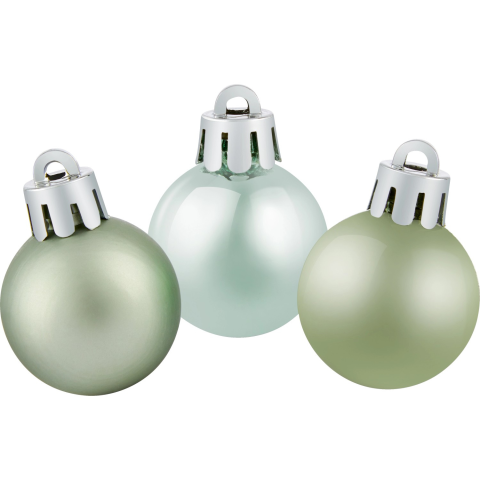 A karácsonyfagömb-készlet segítségével a karácsonyfa ízlésesen feldíszíthető. Kilenc mentazöld színű gömbből áll. A műanyagból készült karácsonyi dísz átmérője 3 cm. A különböző kialakítású felületek különösen szépnek bizonyulnak: A készlet matt és fényes gömböket tartalmaz.