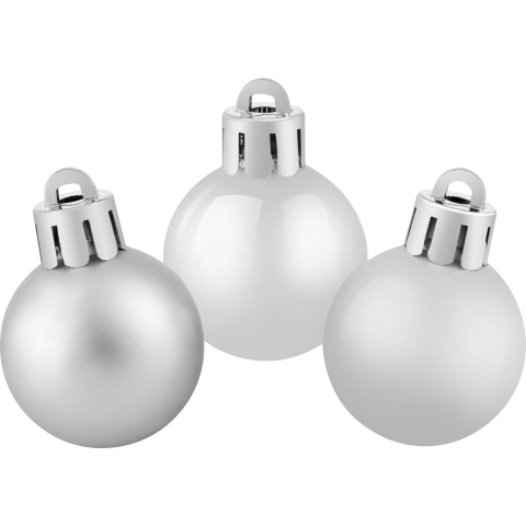 A karácsonyfagömb-készlet segítségével a karácsonyfa ízlésesen feldíszíthető. Kilenc ezüst színű gömbből áll. A műanyagból készült karácsonyi dísz átmérője 3 cm. A különböző kialakítású felületek különösen szépnek bizonyulnak: A készlet matt és fényes gömböket tartalmaz.