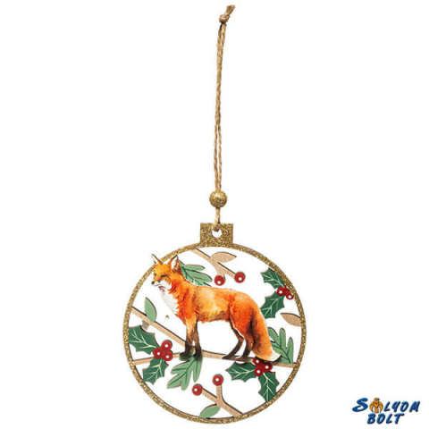 Dekoratív és kedves rókás mintájú ablakdísz /ajtódísz. A csillogó arany színű keretben piros bogyós magyal ág között róka látható. A felakasztható dísz kör átmérője 10 cm. Anyaga: fa.