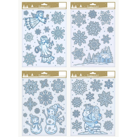 A téli és karácsonyi ablakképek 4 különböző motívumkészletben kaphatók. Az ablakdíszek ezüst és kék színűek, méretük pedig 21 cm x 32 cm. Ablakokhoz és más sima felületekhez ideálisak. Semmi másra nincs szükség, mivel ezek a képek statikusan öntapadóak. Ezeket a karácsonyi képeket maradéktalanul eltávolíthatja és újra felhasználhatja. Ezek a lehúzható üvegképek, amelyek gyönyörű, hópelyhekkel és jégkristályokkal körülvett hóembereket, angyalokat