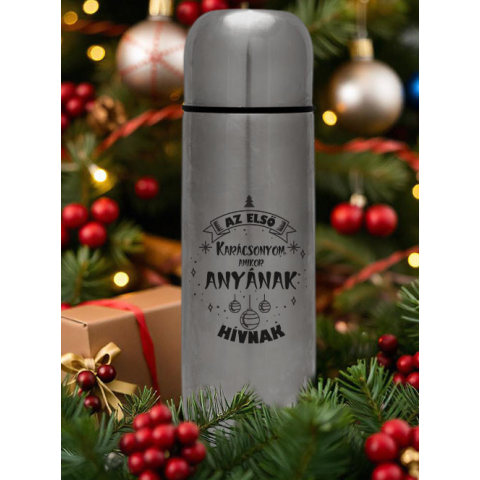 Karácsonyi ajándék szülőknek, termosz első anyukáknak. Az első karácsonyom amikor anyának hívnak felirattal. Újdonsült anyukáknak a legjobb meglepetés karácsonyra. Melegen vagy hidegen is tudja tartani az italokat, űrtartalma: 500ml-es vagy 750ml-es.