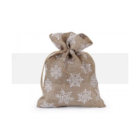 Ajá,ndé,k zsá,kocska pehely mintá,val juta imitá,ció,. Csillá,mos glitterrel van dí,szí,tve. Szaté,n madzag segí,tsé,gé,vel zá,rható, be. Dí,szí,té,sre alkalmas. Szé,lessé,g: 13 cm Magassá,g: 18 cm Magassá,ga a zsinó,rig: 13 cm Juta imitá,ció,ö,sszeté,telpolié,szter ,