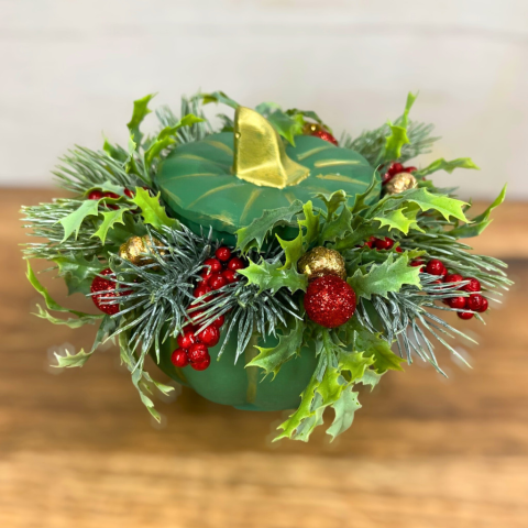 1 kép Karácsonyi asztaldísz – Zöld, tök asztali kompozíció piros-arany díszekkel (16 cm)