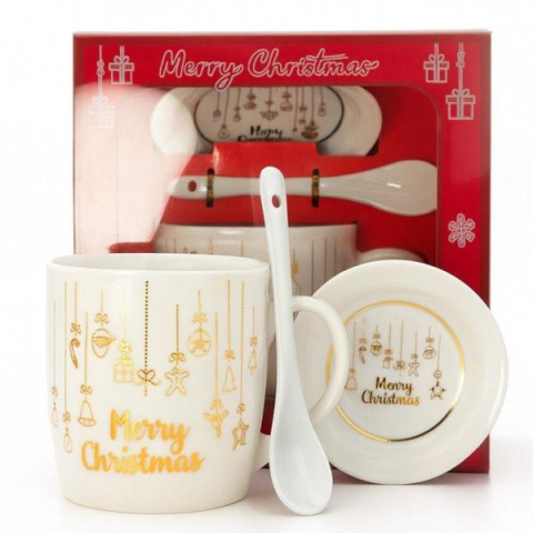 Karácsonyi bögre szett – fedővel, kanállal KB33WZ4Ez a karácsonyi motívumokkal díszített kerámia bögre szett tökéletes ajándék minden tea- és kávérajongónak.Elegáns arany-fehér színe és ünnepi mintázata különleges hangulatot teremt a hideg téli napokon, miközben a meleg italok fogyasztása igazi élménnyé válik.Általános jellemzők:Anyag: kerámia Szín: fehér, arany részletekkelŰrtartalom: 350 mlMéretek: 8,5 × 9 cmFedő átmérője: 9,5 cmKanál hossza: 1