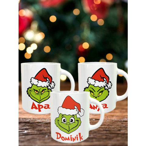 Karácsonyi bögre szett, Grincs család. Karácsonyi családi bögre szett a szeretet ünnepére apának, anyának, és gyereknek humoros grincs figurával. Népszerű Grinch figurás bögre az egész családnak névre szólóan. A rendelésben megadott gyereknévből következ