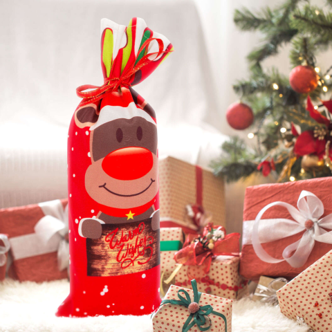 1 kép Karácsonyi italos üveg tartó szalaggal - rénszarvas - poliészter - 32 x 12,5 cm