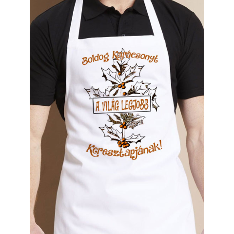 Karácsonyi kötény, legjobb keresztapa. Boldog karácsonyt a világ legjobb keresztapjának, kötény, tartós mintával, örök emlék marad, ami minden főzni kedvelő keresztapa büszkén fog viselni. A kötény fekete és fehér színben is rendelhető. Anyaga vászon.